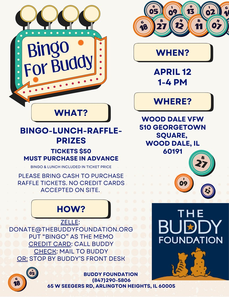 Events Bingo for Buddy Wood Dale VFW 2149 April 12, 2026 , 1:00 pm – 4:00 pm VFW 2149 Wood Dale 510 Georgetown Sq Wood Dale IL Join us for Bingo, lunch and raffles! Tickets are $50 and must be purchased in advance. Photos from the event… Prev Next