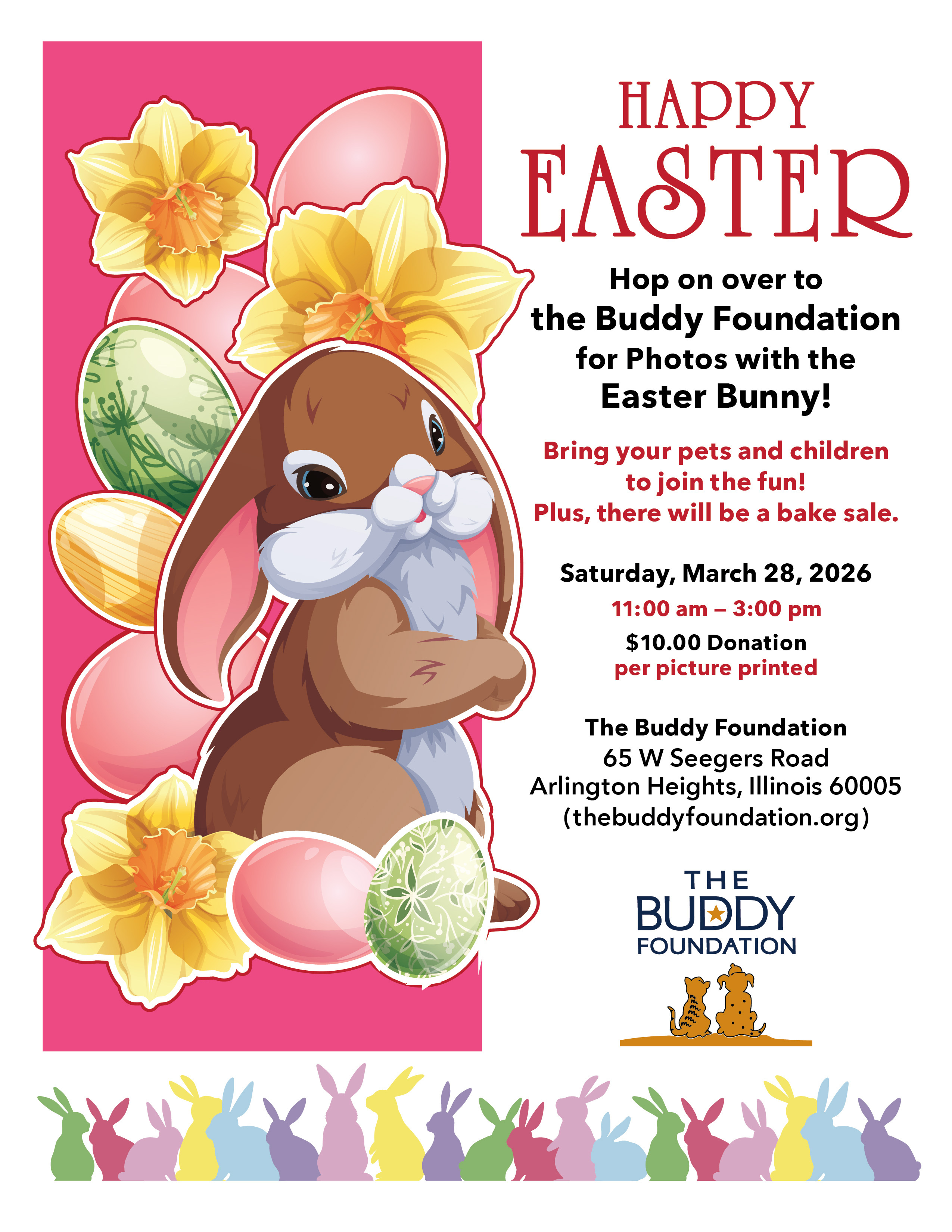 Hop on over to The Buddy Foundation for photos with the Easter Bunny! Bring your pets and kids! $10 donation per printed picture. We will also be having a bake sale and our gift shop will be open.