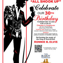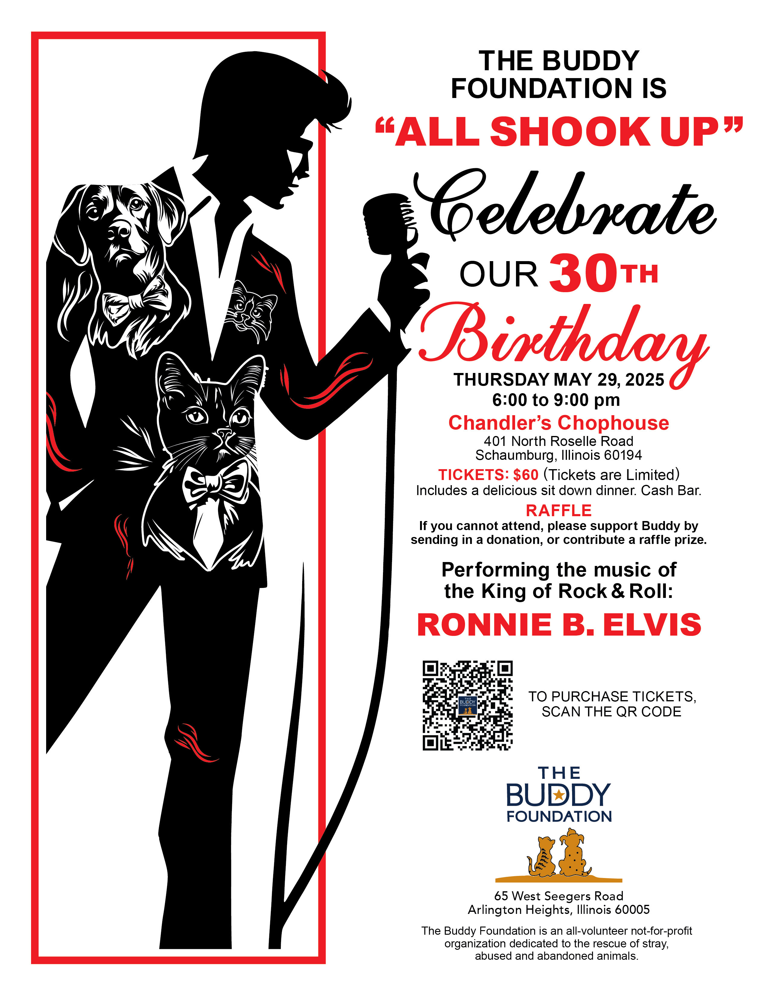 Welcome to The Buddy Foundation's "ALL SHOOK UP" to Celebrate our 30th Birthday! Join us for a rockin' good time as we celebrate three decades of saving furry friends. The event will kick off on Thu, May 29, 2025 at 6:00 PM at 401 N Roselle Rd. Get ready to dance, mingle, enjoy a sitdown dinner, win some great raffle prizes, and support a pawsome cause. Don't miss out on the fun - mark your calendars now!